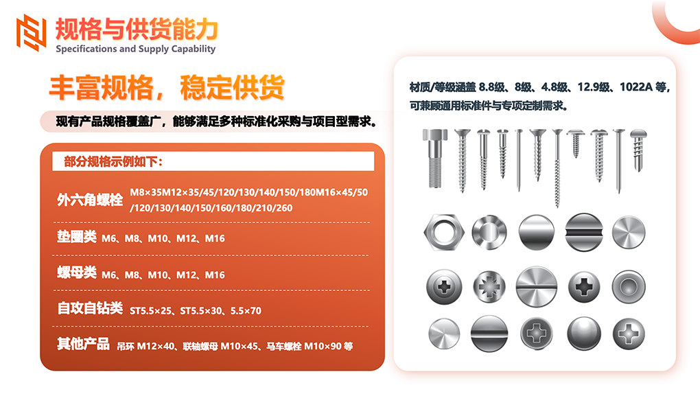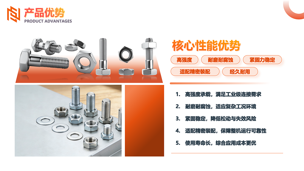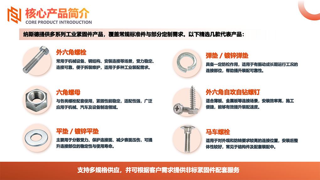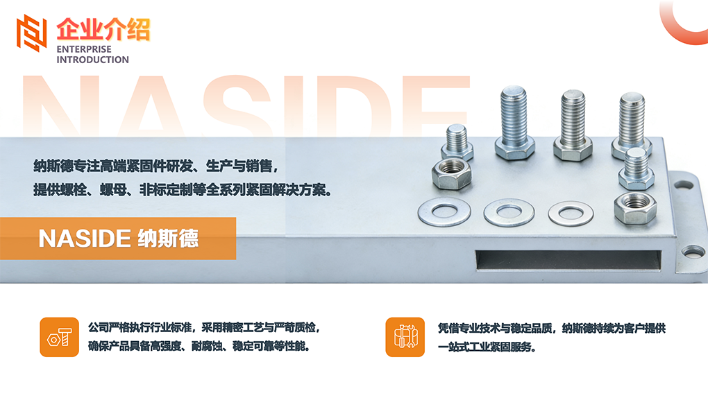 纳斯德专注高端紧固件研发、生产与销售,提供螺栓、螺母、非标定制等全系列紧固解决方案。严格执行行业标准,采用精密工艺与严苛质检,确保产品高强度、耐腐蚀、稳定可靠。广泛应用于机械、汽车、新能源、装备制造等领域,以专业技术与稳定品质,为客户提供一站式工业紧固服务。