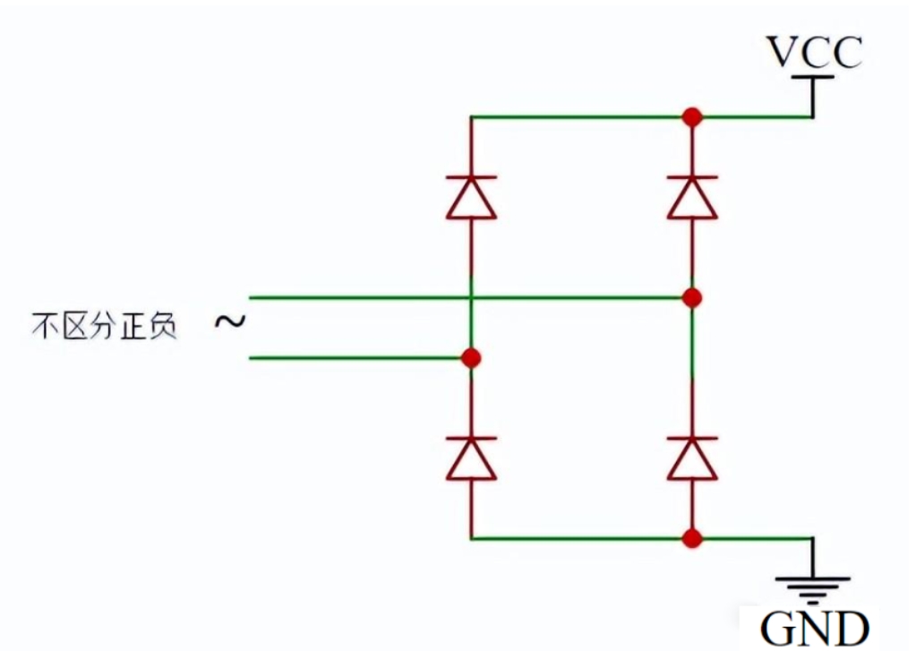 很多电子元器件是不允许电源正负极反接的,在设计完成的电路板中,外部接口如果没有防反接设计,用户在使用的时候很容易将正负极接错导致器件烧毁造成财产损失。防反接设计电路的原理就是在电源输入的前级将电源整流至确定的极性再接入固定的后级。如图3-1所示:
